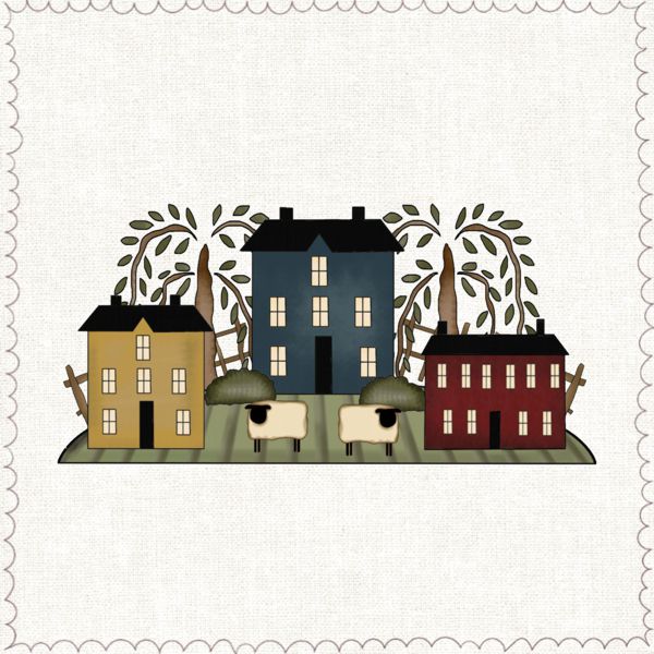 Casas Primitivas es una ilustración de inspiración country y primitiva que representa la sencillez del hogar rural: casas alineadas, ovejas tranquilas y árboles estilizados que envuelven la escena con armonía y equilibrio.
