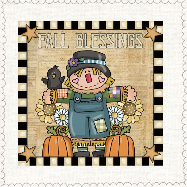 all Blessings es una lámina de estilo country que celebra la belleza del otoño y la sensación de hogar. El espantapájaros sonriente, rodeado de calabazas, girasoles y detalles patchwork, evoca los campos tranquilos, la cosecha y los pequeños rituales de agradecimiento propios de esta época.