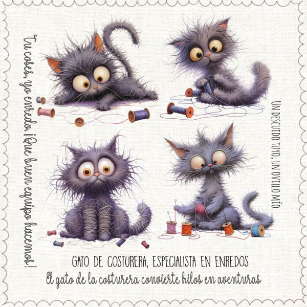 Ilustración compuesta por varios gatos de estilo ilustrado, con expresión divertida y detalles relacionados con la costura (hilos, bobinas, agujas), formando una escena narrativa y dinámica y cuatro frases divertidas.