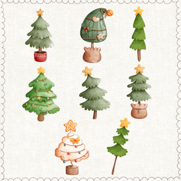 Puedes usar varios pinos juntos para crear una escena invernal, o recortarlos individualmente para adornos, etiquetas, mini cuadros o composiciones textiles.