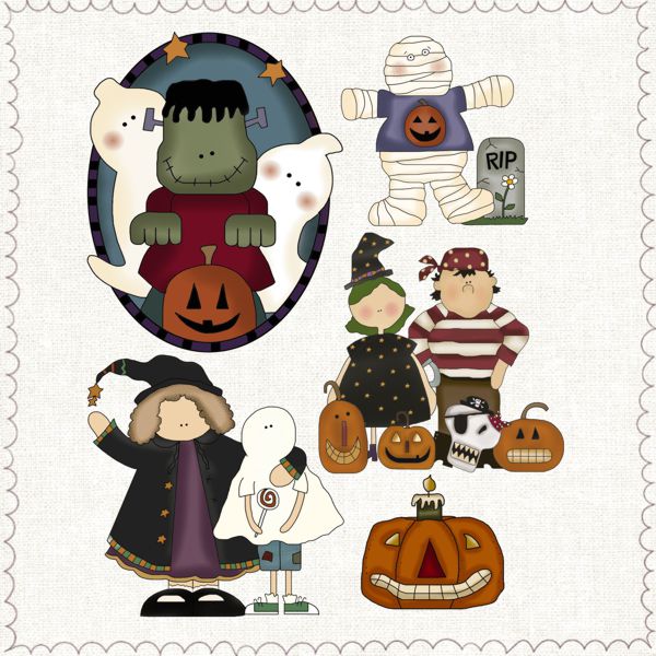 La lámina “Halloween 1” presenta una colección de ilustraciones infantiles de Halloween con estilo country y naïf: un Frankenstein adorable, una momia simpática, fantasmas, brujitas, calabazas sonrientes y pequeños personajes disfrazados. Todo con expresiones dulces y colores cálidos que hacen de Halloween una fiesta divertida y acogedora.